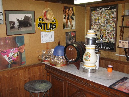 After dinner we walked to a bar called the Stillen Genieter. It was closed. It had a sign on the door written in Dutch with an arrow pointing to the right. We thought that it was saying to go in through another entrance, but we couldn’t find one. We went next door to Café De Gouden Vis, which was a pretty place with an even prettier bartendress. Hapkin (Alken-Maes; 8.5%) had a good slightly sweet aroma and a good, refreshing, semi-sweet flavor. I went back to the Stillen Genieter, which was still closed, and got a passer-by to translate the sign. It said, “If no one is here, ring the bell next door.” So I did, and a portly gentleman came down and opened the bar. It opens every night at 8 p.m. but the owner doesn’t open it until he has to.