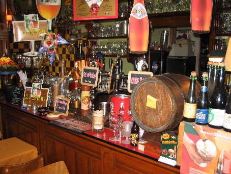We learned a few things from the bartendress and a patron. Mort Subite, which is right next door, bottles only one of its own beers (the Oude Geuze); all others are bottled at an Alken-Maes plant in Alken. Alken-Maes owns Mort Subite, and this is just part of a nationwide trend of big breweries buying up smaller ones. When this happens, brewing gets consolidated into fewer places, resulting in a loss of jobs. I hope that beer quality does not decrease, but I fear that it will as efficiency replaces artisanship. In other news, Dubuisson lost a court battle with Anheuser-Busch over the name of one of Dubuisson’s beers, called Bush. This brings up three points: 1) How can a giant like Anheuser-Busch, who sells cold fizzy urine to tasteless people all over the world, feel threatened by a Belgian brewery’s 12% ABV product that resembles what Anheuser-Busch makes about as much as Britney Spears resembles Roseanne Arnold? 2) Anyone with a first grade education can see that Busch and Bush are spelled differently. 3) Did I mention that Anheuser-Busch products suck? It’s worth repeating.