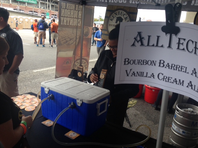At about 2:30 a cask of Loose Cannon was tapped on the stage, which was fortunate since we missed the Opening Tap Ceremony that had happened a few hours earlier. Below left is a photo; below right is a video.