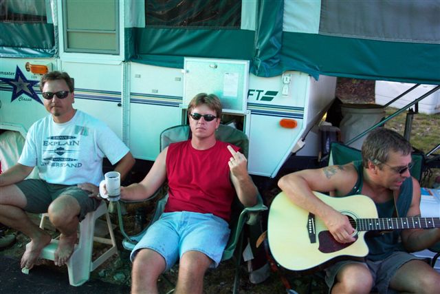 Later that night we revisited Keg Row, listened to musicians jam around the campfire, and hung out at Camp CRABS. At one point someone announced that James had fallen asleep with his ass sticking out of his tent, and Jim, being the compassionate, sensitive person that he is, exclaimed, "Let's fuck with him!" Then he and a few others headed off to James's tent humming the theme music from "Deliverance".