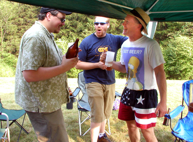 Jim took the hill from the Viet Cong on Thursday night, once again ASS-uring us a spot. CRABSers and Cross Street Irregulars trickled in like a stream of urine after drinking Devil's Milk, which by the way was available at our site all weekend, along with Art's peach ale, Grover's Pentagram Porter, Rob's Taps Cream Ale, and something else (a doppel?). I also inflicted my wit (beer, that is; I have no wits about me) and my hefeweizen, which took 4th place in the wheat beer contest because I bent over for the judges. That should give you an idea of how bad it was: I let myself get Deliveranced and I still only got 4th.