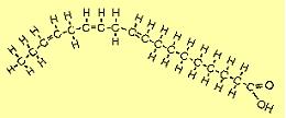 | The molecule to the right is alpha linolenic acid (C18H30O2). The first double bond occurs at the 3rd carbon from the omega end, so it is sometimes referred to as an omega-3 FA. Note that it bends more than other FAs because of all the places where adjacent hydrogens repel each other. | ![]() |