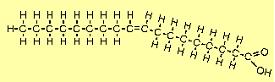 | The molecule to the right is oleic acid (C18H34O2). There is one double carbon bond, and since this uses two electrons from each carbon atom, each has only two bonds left. Since one from each is already bound to another carbon, each can bond with only one hydrogen atom. Note that the molecule bends because of the opposing negative charges of the hydrogen atoms. FAs such as this with one double bond are referred to as mono-unsaturated fatty acids (MUFAs). | ![]() |