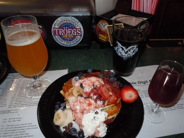 Next it was on to Mahaffey's for "Pints and Pancakes". A nice lineup of ales was served with pancakes. There was a fixins bar where you could top your cakes with Smuckers blueberry or strawberry syrup, chocolate syrup, chocolate morsels, blueberries, strawberries, bananas, and whipped cream. We washed it all down with the following libations: