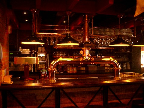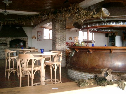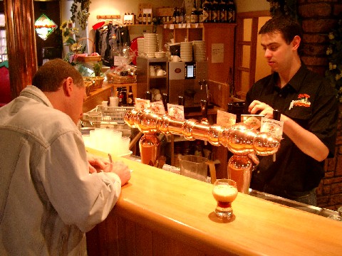 As you walk in there is half of a large copper kettle on each side of you, the cut sides against the walls and the outer edges facing you. There are also several old wooden barrels. A sign, written in French, in front of the brewing equipment said that they make 800 liters per batch. We each got a beer sampler that had the four house brews. Blonde had light body, slightly sweet flavor, and slightly noticeable hops. It was good for a light beer. Blanche was even lighter than the Blonde, and didn’t have much flavor. Amber was a good, clean, semi-malty beer. Scotch was a tiny bit caramelly, roasty, and not very good. We ate very good, flat, crunchy pizza. For dessert we had a nice dame blanche, although it was difficult to enjoy it through all the cigarette smoke. We bought several bottles of their beer and hit the road.