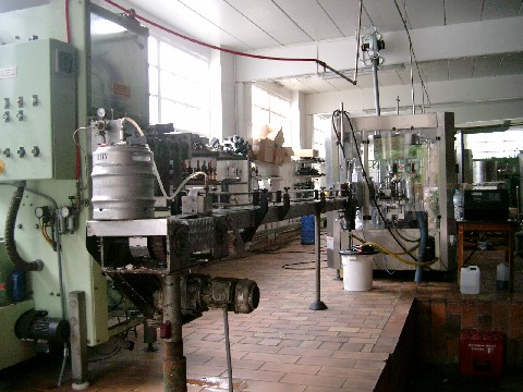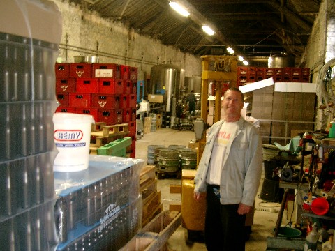 Abbaye des Rocs used to be an abbey farm. It has beautiful grounds with nice flowers. A man named Luc gave us a very good tour. It’s a small operation that makes about 3200 hectoliters a year. Nothing is filtered. They make five year-round beers and one Christmas beer. The brewery is in an old musty building and uses old equipment. Both the bottled and the kegged beer are conditioned in a 26°C (79°F) “warm room”. Their kegs are 5-gallon, with one big valve in the center that looks like a very large ball lock valve. They export 70% of their beer to Italy, Australia, Japan, France, the U.S., and a few other places. The owner, Jean-Claude Maréchal, lives in an adjacent house. He started the brewery in 1979 on a bet with his father-in-law. He used to be the brewer, and he turned the job over to his daughter Nathalie around 1994. She also lives in an adjacent house. We got to meet her and her dogs as we tasted beers. The tasting room is old and brick, and has a round wooden bar. Altitude 6 (6%) was a good light estery beer. Nounnette (7.5%), a blond, is their only beer that does not contain any spices. It was good and clean. Blanche des Honnelles (6%) had a good, sweet, spicy flavor with fairly light body. Abbaye des Rocs (9%), which contains five types of malt, was good, fruity, raisiny and alcoholic. We were also treated to their new beer called Nuyts Blanche (6.8%), which had not yet been released and didn’t even have a label designed for it yet. It’s made with currants. It had a nice fruity aroma and a good fruity, slightly tart flavor with no sweetness. It is possible that Marty and I were the first Americans to try this beer.