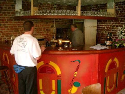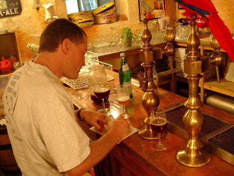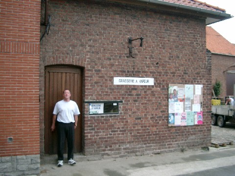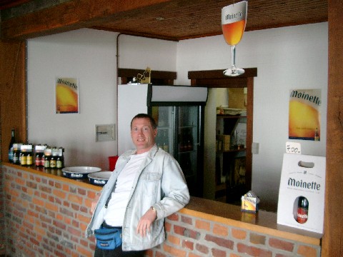 When we got back to Rulles they were still setting up the tent. We helped them finish, then we all went back to the tasting house. We drank the homebrew, which was thicker and sweeter than their Tripel because I didn’t find out the original gravity last time so I overshot it. This time Gregory told me: it’s 18.25 Plato (1.073). He uses Styrian Golding and Hallertau hops. Orval yeast is used in all his beers, and he gets a fresh culture every six months (I assume it’s the same yeast used at Brasserie de Bouillon, but then again, maybe Orval has a yeast bank with strains that aren’t in its beer). Anyway, the labels I put on the homebrew bottles were made from pictures of our last trip there. One showed the outside of the brewery; and the other showed Marty, Mike and me drinking inside the tasting house. Gregory loved them, and he put them up on the tasting house mantle for display. As far as I know they’re still there.