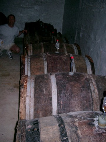 We took a break from the beers with some Spanish wine. Paternina Crianza 1999, from Rioja, Spain, was fairly good. Then we had some Del Pino Oloroso, which our hosts had in a wooden cask in their kitchen because Marga’s parents own the Del Pino winery. It had a light amber color; a nice aroma reminiscent of amaretto and honey; and a semi-sweet, alcoholic flavor. The ABV is 18% because grain alcohol is added after fermentation.