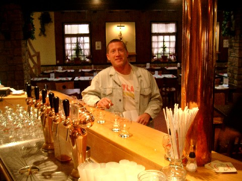 That night we partied at the home of Marty and Michelle’s friends Ray and Pam and tried several of our Belgian booty. Arabier (De Dolle; 6%) was good, spicy and hoppy. Nostradamus (Caracole; 9.5%) had a good, malty, sweet aroma and flavor. Vapeur Cochonne (A Vapeur; 9%) was tart, fruity, and just okay. We snuck in a French beer called Telenn Du (Brasserie Lancelot; 4.5%) that Marty had picked up in Normandy on another trip. It was a pretty good beer with a slightly roasty flavor and medium body. We also tried all seven of our Brasserie de Silly beers. Super 64 (5.2%) was light, a little sweet, and just okay. Silly Saison (5%) was somewhat sweet and pretty good (certainly better than the mishandled draught version that was inflicted on us at that Silly dive). Double Enghien Blonde (7.5%) was good, light, semi-sweet, and smooth. Scotch Silly (8%) was pretty good: malty and sweet, yet not heavy. La Divine (9.5%) was also pretty good: smooth and somewhat sweet with fairly light body. Titje (5%), a witbier, wasn’t bad but it was light in flavor and kind of thin. Printemps de Silly (6.5%), one of the few unfiltered Silly beers, was a nice semi-sweet, slightly estery beer with light-medium body. We finished up with Saison Dupont. Most of the other people there were pounding German beers in addition to the Belgian beers we were tasting, which shows what a wimp I am. We got to bed at 1:30 a.m.