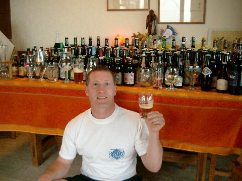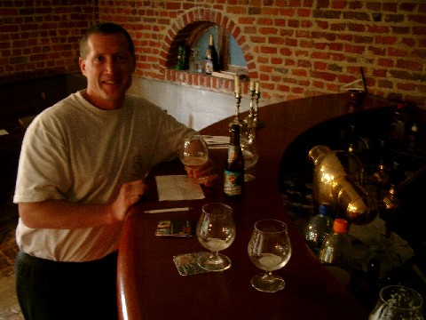 A short drive later we were in Rulles at the first Belgian brewery we had ever visited: Artisanale de Rulles. It was the first stop on our previous year’s excursion, and although there were only two of us this time (Mike was slaving away at his job and hatin’ life), brewer Gregory Verhelst and his assistant Olivier remembered us. I gave them a couple of bottles of homebrew that I had made with yeast cultured from a bottle of their Tripel. The four of us went into the small tasting house across the street from the brewery, where Gregory put the homebrews in the fridge and opened a new beer he had brewed to celebrate the brewery’s 4th anniversary: Cuvée du 4ème Anniversaire (5.2%). It was a nice light, refreshing, hoppy, estery beer. We had obtained our Belgian beer maps here the previous year, so we picked up a few more. Gregory said that he was going to start exporting his beers to 40 U.S. states by fall 2004. The first would be his Tripel (which is my favorite Rulles beer).