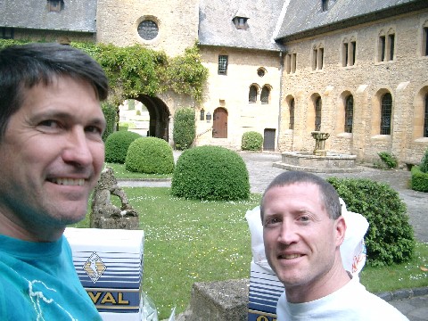 The beautiful tree-lined roads and great weather made for a pleasant half-hour drive from Rulles to Orval. The monastery is like a big stone castle, except it’s not very tall. Visitors were arriving by the busload. We bought 48 bottles of beer and several kilos of cheese. They make two kinds of cheese, called simply “new” and “old”. The “old” cheese is harder and tastier than the new, but they’re both fantastic. We sat outside the monastery drinking the beer and eating the cheese, still unable to get the full effect of the beer but thoroughly enjoying the cheese. The tall grassy field had some dark-colored animals that looked like either sheep or goats.