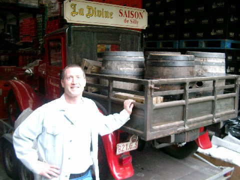 We walked through the old, musty, dirty brewery and met the new brewer, Jerome. I was dying to know what kinds of hops are in Saison Dupont, so I asked. He said Kent Goldings, Styrian Goldings, and Spalt (though he didn’t say which were for bittering and which were for aroma). I gave him a bottle of my home-brewed saison, which was inspired by and tastes a lot like Saison Dupont. The label I put on it has a picture of me and Mike standing in front of Les Caves Dupont, which is a bar across the street. Jerome was so flattered by the gift that he brought us to the tasting room and gave us a cold, 750-ml bottle of Saison Dupont (6.5%). It was earthy, estery, a bit tart, and great.