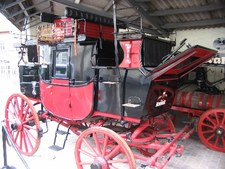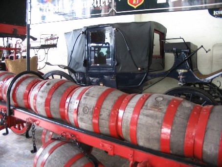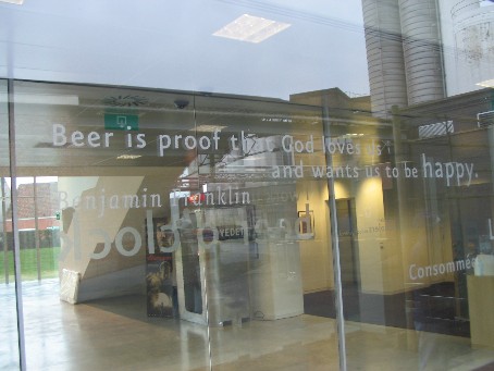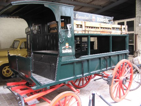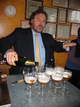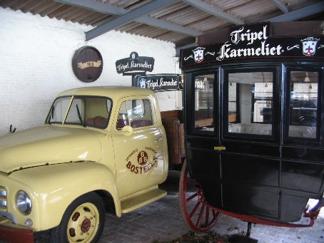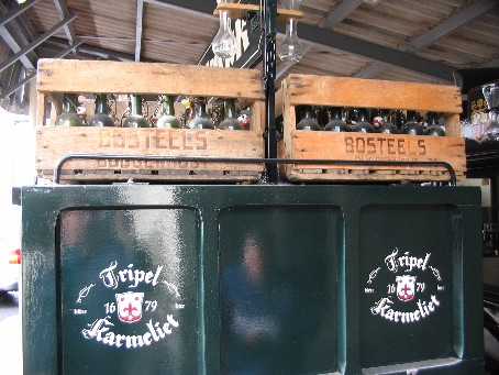 We drove to Buggenhout and arrived at the Bosteels brewery just before noon. Outside there were old stagecoaches with old flip-top bottles in them, and a classic pickup truck with a wooden bed. Normally brewery tours are by appointment only, but we got lucky – we wandered into the tasting room and there was already a group of Americans who had just gotten a tour. We had missed seeing the brewery but we were allowed to stay and taste beer and see a video about the brewery. The owners themselves, an older couple named Evo and Maries (sp?), served us. Tripel Karmeliet (8%), whose recipe goes back to the 1600s, had a nice sweet, estery aroma and flavor. It’s made with oats, wheat and barley. Kwak (8%), whose recipe is from the late 1700s, was quite malty and fairly good. Kwak is served in a “coachman’s glass”, which has a very thin middle and a big bulb on the bottom. Under the Napoleonic code, coachmen were not allowed to leave their coaches, so this glass was designed to hang on a special holder on the coach’s side. Deus (11.5%), pronounced DAY-us, is a beer made with the champagne method: it’s stored on its side, and every day the bottles are turned and uprighted just a little bit, until they are completely upside down and the yeast is in the necks. This process is called riddling. The necks are frozen, the bottles are turned right side up, and the tops are removed, taking the yeast with them in little cylindrical ice cubes. Deus is served when it’s 2 years old. Evo referred to it as a sparkling barleywine. It had a very light body for such a strong beer, like champagne, and a good, somewhat sweet aroma and flavor with no dry aftertaste.