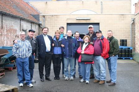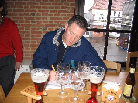 Brewer Gregory Verhelst gave us a warm greeting. This was our 3rd visit to his place. He brought us into his office and let us try a new beer (~9%) that he had made with the same yeast strains that Orval is made with. He hadn’t given it a name. It had a very good horsey, alcoholic aroma and flavor. It was sweeter and less hoppy than Orval. The recipe is the same as his Triple; the addition of the Orval strains is the only difference. Then we drank my homebrewed attempt at cloning his Triple. I had attempted another clone a year earlier, but my gravity had been too high. Gregory subsequently told me his Triple’s gravity, so I tried again at this gravity, and this time the beer turned out much closer to what I was shooting for. It wasn’t an exact duplicate, nor was it as good as his Triple, but he did find it “very drinkable”. He said that because I don’t have access to the same malt and water he uses, it would be very difficult to clone his beers.