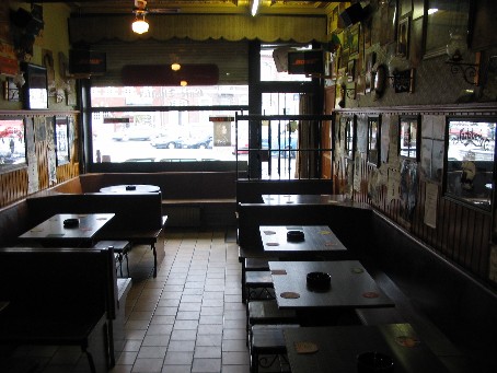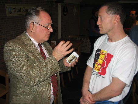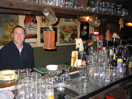 We learned a few things from the bartendress and a patron. Mort Subite, which is right next door, bottles only one of its own beers (the Oude Geuze); all others are bottled at an Alken-Maes plant in Alken. Alken-Maes owns Mort Subite, and this is just part of a nationwide trend of big breweries buying up smaller ones. When this happens, brewing gets consolidated into fewer places, resulting in a loss of jobs. I hope that beer quality does not decrease, but I fear that it will as efficiency replaces artisanship. In other news, Dubuisson lost a court battle with Anheuser-Busch over the name of one of Dubuisson’s beers, called Bush. This brings up three points: 1) How can a giant like Anheuser-Busch, who sells cold fizzy urine to tasteless people all over the world, feel threatened by a Belgian brewery’s 12% ABV product that resembles what Anheuser-Busch makes about as much as Britney Spears resembles Roseanne Arnold? 2) Anyone with a first grade education can see that Busch and Bush are spelled differently. 3) Did I mention that Anheuser-Busch products suck? It’s worth repeating.