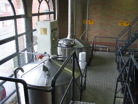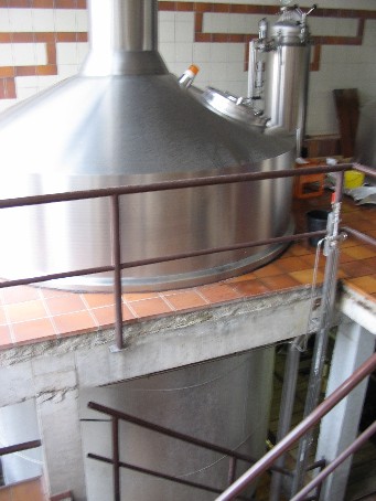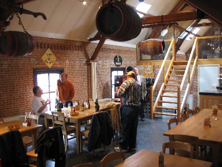 The brewery originally operated from about 1500 to 1944, after which it only bottled for several decades. Brewing operations started again in 1997 with new equipment. The tasting room is all wooden: the bar, the floor, the chairs and the tables. All the beers are filtered after fermentation, and fresh yeast is added for conditioning. Mr. Landtsheer said that other Belgian breweries, such as Van Steenberge and Westmalle, do this. He let us sample his beers, which were served from 20-liter kegs. Malheur 6 (6%) had a lager-like aroma and a fairly good slightly sweet flavor. Malheur 10 (10%) had a nice malty, estery aroma and a nice somewhat estery/sweet/hoppy flavor. Malheur 12 (12%), a dark, 1-year-old beer with a secret mixture of herbs, had a fairly good plummy/sweet/malty aroma and flavor. There is also a Malheur 8 (8%), which is only for bottled export; the reason has to do with the fact that taxes triple on beers above 8%. They also make a champagne beer called Malheur Bière Brut (11%), which is made in a similar fashion to the Bosteels Deus. It starts out as Malheur 10, but after filtering, it is given a champagne yeast and a little more priming sugar than the other beers receive. Champagne yeast is used because it’s less sticky and slides down the bottle better than beer yeast does during riddling. This beer had a nice somewhat fruity/estery aroma and a quite good somewhat sweet/estery/alcoholic/fruity flavor. There is also a dark version of this beer but it was sold out. Mr. Landtsheer claims that the attenuation he gets is 91% for his regular beers and 94% for the champagne beers. (For those who aren’t beer geeks, attenuation is the percent of wort sugars that get fermented. Most yeasts get about 75% attenuation.) All the beers are made with 100% barley malt.