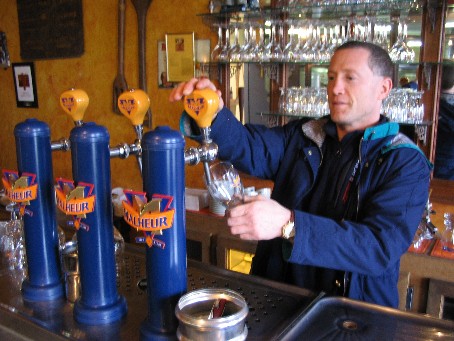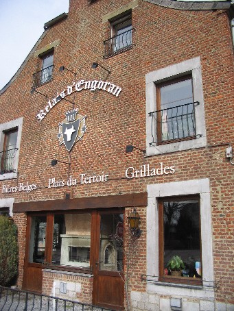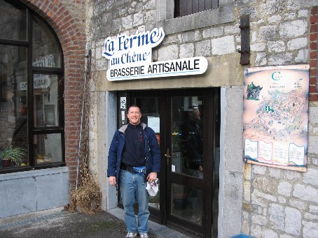 We drove around the corner to Mr. François’s restaurant, the Relais d’Engoran. The décor theme is “Histoire de la Guerre de la Vache” (History of the War of the Cow), with old, dark wooden furniture and ceilings. There is a fake prison cell with a troll in chains. In addition to about 60 beers from various breweries, this place serves several beers that are available only there. These house beers are contract brewed and bottled by Van Steenberge and carry the name Brasserie François on the label. The place around the corner that had closed was just a distribution center, so there never was a Brasserie François per se. Mr. François was very congenial. He showed us a video about the restaurant and the beers, and he served us our beers personally. We got the sampler: three Brasserie François beers in ceramic chalices. La Condruze (7.5%) had a light malty/caramelly aroma and a good smooth, somewhat malty, alcoholic flavor. La Filée (8%) had a nice estery, sweet aroma and flavor. La Triple d’Engoran (9%) had a good fruity, cidery aroma and flavor. The food was wonderful. We bought some of his beer to take with us after lunch. As we left, he gave us a couple of ceramic chalices for free. I highly recommend the Relais d’Engoran, which is open Wed-Sun 11 a.m. to 10 p.m.