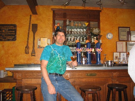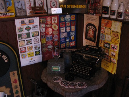 We went back to the hotel and got two of our old favorites out of the car (the weather was still cold and cloudy so the beer was kept at great drinking temperature). We drank them in one of our rooms (we had rented a triple and a quad because five more people would be joining us that night). Dulle Teve (De Dolle; 10%) had a nice estery, sweet aroma and a nice malty, estery, spicy, sweet, alcoholic flavor. Delirium Tremens (Huyghe; 8.5%) had a nice estery, spicy, fruity, sweet aroma and a nice spicy, estery, fruity, sweet flavor. Then we went to the hotel bar. Diekirch Grand Cru (Diekirch; 5.1%), from Luxembourg, had a caramelly aroma and flavor that were one-dimensional and adequate at best. Belle-Vue Gueuze (Interbrew; 5.5%) had a good fruity aroma and a good fruity flavor with just a hint of mustiness. It had no yeast and was not a real gueuze. The bar, like the lobby, is pretty and looks like something out of the first half of the 20th century. Old furniture in the bar and Oriental-looking rugs in the lobby give it a nice ambience. The bar also has an Internet terminal next to an old telephone switchboard. The computer’s keyboard is a bit different from the kind Americans are used to: some letters are in different places, and the digits and special characters are reversed (i.e. you have to hit SHIFT for digits but not for ampersand, percent, etc). Marty got his E-mail and I wrote until Michelle, her brother Bill, her cousins Ann and Russ, and our friend Steve showed up.