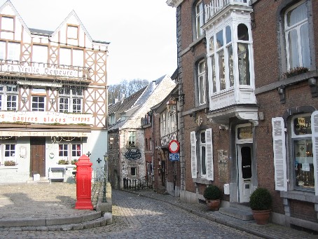 We have spent more time in Bouillon than in any other Belgian town. This was my 3rd time there and Marty’s 4th. It’s a pretty little place tucked in a mountain valley with a river running through it and an old castle on a hill overlooking the town. We checked into Hotel de la Poste and immediately went drinking at La Vieille Ardenne. Maredsous 10 (Moortgat; 10%) had a nice alcoholic, fruity, cidery aroma and a good alcoholic, fruity, cidery flavor. St. Louis Gueuze (Van Honsebrouck; 4.5%) had a good moderately tart aroma and a good somewhat tart, fruity, cidery flavor. It had no yeast and was too sweet to be a real gueuze. Leffe Blonde (Leffe; 6.6%) had a pretty good slightly estery aroma and a good estery, spicy, sweet flavor. I had to step outside the bar to enjoy it because it was so smoky in there.
