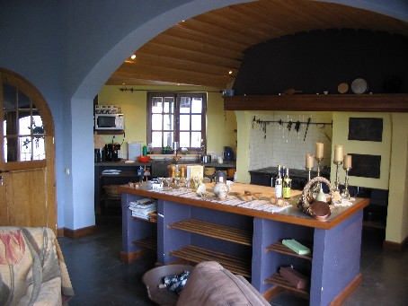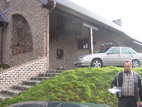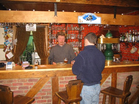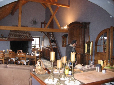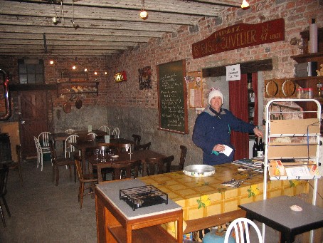 Thursday the 10th. The dining room at our “hotel” has a big fireplace and a high ceiling. The kitchen, which is in the same room, has a big griddle. We were served breakfast by Guido Servayge, who runs the place with his wife, Carine Callens. (It is the norm in Belgium for married women to keep their maiden names.) He is a large, burly, powerful-looking man who made me wonder why I ever bothered to lift weights because I could never hope to attain his size or strength even if I lived at Gold’s Gym and popped steroids like Bob Dole pops Viagra. Anyway, he’s a carpenter, and he showed us pictures of homes and taverns he has built. He said that many new taverns get bricks that look old in order to create atmosphere. If you’re ever in the Pipaix area, you might want to stay at Chambres d’Hôtes.