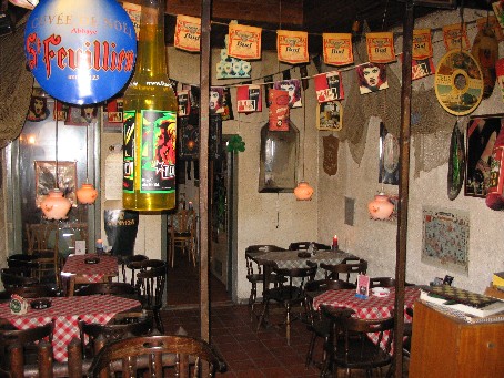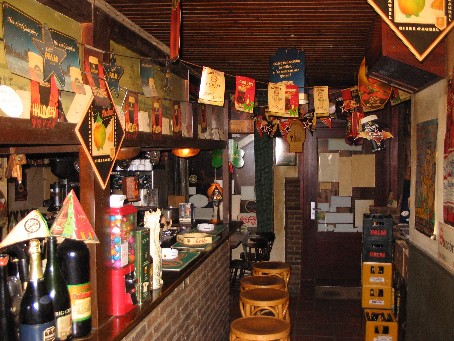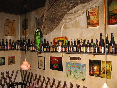This lambic brewpub had smoking and nonsmoking sections. I’m hoping this means that Europe is moving toward smoke-free establishments. (I heard that Ireland had recently banned smoking in bars.) The décor was nothing special, but we were there for the beer. Beersel Bio (7%) had a pretty good slightly sweet and smooth aroma and flavor. Lambik 3 Fonteinen, on draught, had a good fruity, somewhat tart aroma and a good, quite tart, musty flavor, like a gueuze. Unfortunately it was mostly flat. Oude Geuze 3 Fonteinen, also on draught, had a very nice tart aroma and flavor. Oude Kriek 3 Fonteinen (5%) had a deep burgundy color; a good malty, fruity aroma; and a good musty, fruity flavor with a tart aftertaste. We wanted to buy some beer to take with us but their store is open only Thursday-Saturday 9 a.m. to 7 p.m.
