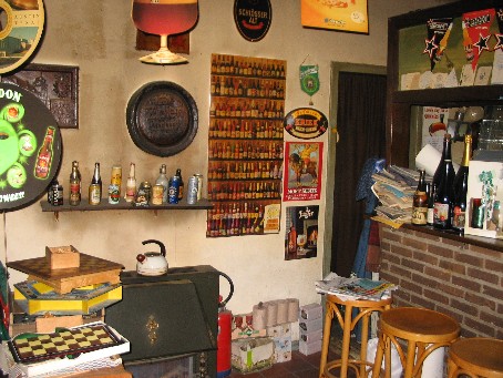 After dinner we walked to a bar called the Stillen Genieter. It was closed. It had a sign on the door written in Dutch with an arrow pointing to the right. We thought that it was saying to go in through another entrance, but we couldn’t find one. We went next door to Café De Gouden Vis, which was a pretty place with an even prettier bartendress. Hapkin (Alken-Maes; 8.5%) had a good slightly sweet aroma and a good, refreshing, semi-sweet flavor. I went back to the Stillen Genieter, which was still closed, and got a passer-by to translate the sign. It said, “If no one is here, ring the bell next door.” So I did, and a portly gentleman came down and opened the bar. It opens every night at 8 p.m. but the owner doesn’t open it until he has to.