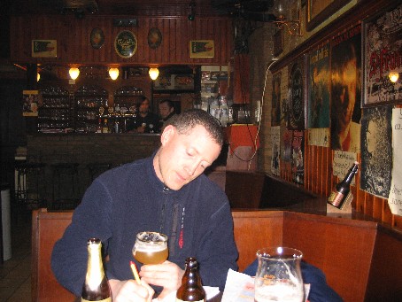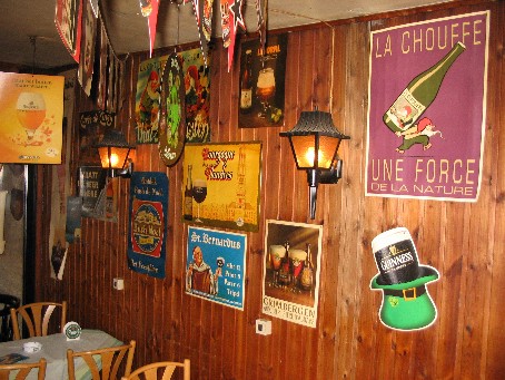 I retrieved Marty and we entered. It was a nice dark, cozy place with lots of posters on the walls and a brick bar with a wooden top. Behind the bar were stairs to a cellar where the beer is kept. Classical music played in the background. We had the place to ourselves for about a half hour before someone else came in and fouled the air with smoke. The place has been open since the mid 1980s. The beer menus are basically books because they list about 300 beers. The beers are arranged by genre: abbey, Trappist, fruit, seasonal, non-Belgian, and nonalcoholic. I did not recognize many of the brewery names, probably because they don’t exist anymore.