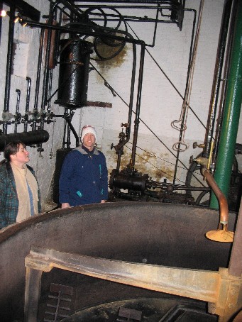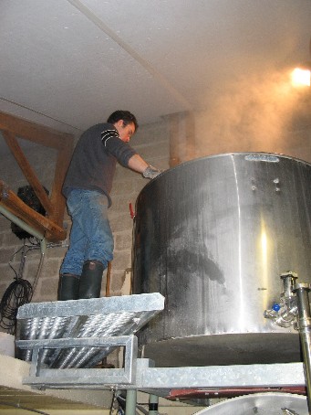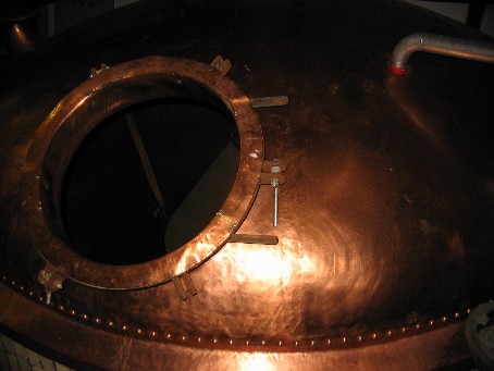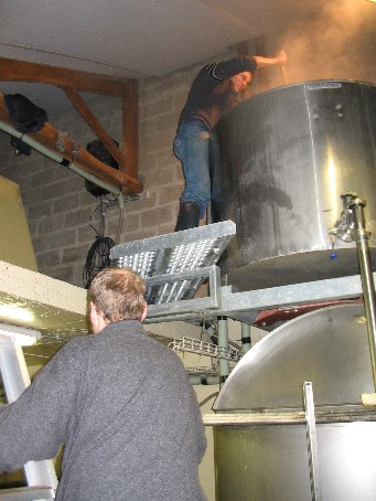 On a whim we went to Pipaix, where Brasserie A Vapeur is located. I had met brewer Jean-Louis Dits and his wife Vinciane Corbisier two months earlier at a Belgian beer conference in Arlington VA called Spirit of Belgium. The tiny town seemed empty. We parked in front of a bar (which was closed) and walked down the road to the brewery. Someone was coming the other way in a forklift, and sure enough it was Jean-Louis. We greeted him, and he radioed Vinciane to let us into the brewery while he finished his work. The brewery was built in 1785. In 1895 it was converted to steam power, and they still use the mash tun that was made that year. The large belts and sprockets were reminiscent of those you might find in a large clock tower. This is the only completely steam-powered brewery in Belgium, and possibly the world, which is how it got its name (vapeur is French for steam). They have two steam boilers so that there is always a backup. They brew 1000 gallons at a time, and it goes into their 4000-liter fermenter. None of their beers are filtered. They also have a distillery where they distill their own beer into spirits.