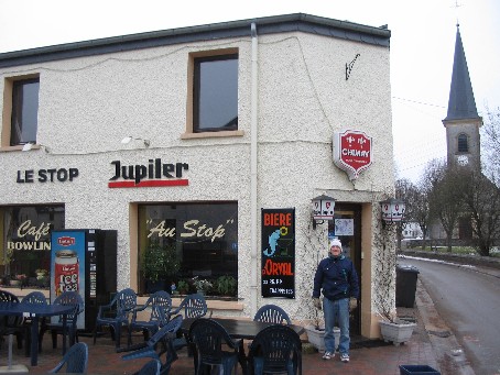 Next we landed in Suxy to drink at a bar called Au Stop. Around the side of the bar, inside the building, is an old bowling alley, no longer in use, that starts out only a foot wide, then about halfway down gets wider. The bar has been in operation since 1992. As people came in, everyone greeted everyone: men shook men’s hands; men and women kissed each other on the cheek. La Gaumaise (the label said “Créée par Brasserie Maire Meix Devant Virton”; 5%) had a light slightly fruity aroma and flavor. It wasn’t very good. Abbaye de Bonne-Espérante (Lefebvre; 7.8%) had a good sweet, malty aroma and flavor. Trappistes Rochefort 10 (Abbey Notre-Dame Saint Remy; 11.3%) had a good malty, caramelly, slightly fruity aroma and a pretty good caramelly, alcoholic flavor.