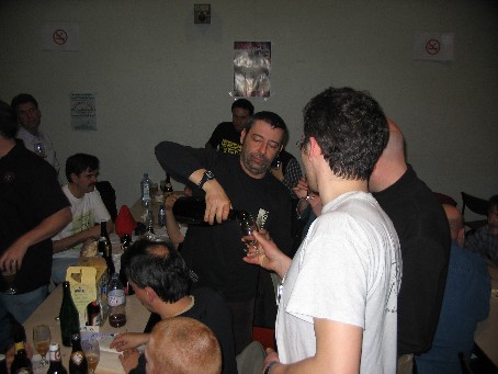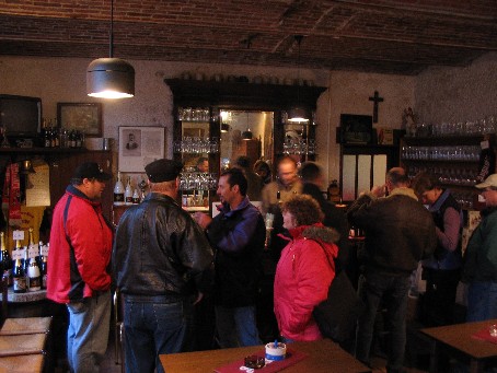 We went back to the tasting room, bringing in our Westmalle cheese, as well as bread and crackers we had brought from Marty’s house. Jean-Louis brought out his own mixture of 20 spices and hops, which went well with the cheese. Cochonne (9%), made with roasted chicory, coriander, sweet orange peel, and lichens, had a slightly sweet/fruity/spicy aroma and a fairly good fruity, somewhat sweet flavor. Next he treated us to a 30-year-old bottle of Saison, made by the Voisin brewery, which went out of business in 1990. It had a nice somewhat tart aroma and a quite good tart flavor. The corked bottle was very dirty and looked 30 years old. I think it’s the oldest beer I ever drank. Our last Vapeur beer of the evening was Mont-Marche Tournai (7.5%). It had a fairly good fruity, slightly spicy aroma and flavor. He makes it every two years. Jean-Louis has brewed at Vapeur since 1984, and he homebrewed for four years before that. We spent close to four hours there and had a marvelous time.
