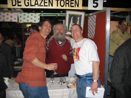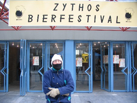 Sunday the 6th. It was 22° with light snow on the ground. Marty and I headed for St. Niklaas, Belgium, where the Zythos Beer Festival (ZBF) was. We passed several towns with humorous names. Did you know that there’s a Frankenstein, Germany? After 8 hours of driving through sub-freezing weather and snow drifts we were 10 kilometers from St. Niklaas, and the bridge we wanted to cross over the Schelde River into town was out. We stopped at a nearby pub called the Sas Café and warmed ourselves with some tomato soup. I asked the teenage bartender for some ice (to cool the soup), and she said that it was too cold out for the ice machine to work. Now, correct me if I’m wrong, but if it’s below freezing out, can’t the machine simply do nothing, and the ice will form naturally? I’m glad I wasn’t ordering food in summer – she probably would have told me that it was too hot out for the grill to work.