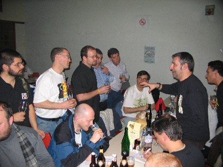 The evening was spent in our hotel room playing cards and lightening the car’s load. The beers kept nice and cold by the open window. Cuvée Ermesinde (Saint Monon; 8%) had a fairly good somewhat malty/fruity aroma and a fairly good malty, slightly alcoholic flavor with a somewhat dry aftertaste. Fruitesse Framboise (Liefmans; 3.5%) had a nice raspberry aroma and flavor. It was sweet but not too sweet, with nice tartness, like a soda but better. Guldenberg (De Ranke; 8.5%) had a good light, fruity, slightly malty aroma and a decent fruity, hoppy flavor. St. Idesbald Blond (Huyghe; 6.5%) had a good fruity aroma and a good fruity, tart, alcoholic flavor with robust carbonation. Hercule Stout (Ellezelloise; 8.4%) had a pretty good roasty, sweet aroma and a fairly good phenolic, slightly roasty flavor. Delirium Nocturnum (Huyghe; 9%) had a good malty, slightly alcoholic aroma and a fairly good sweet, somewhat estery, slightly roasty flavor. Grottenbier Brune (Sint Bernardus; 6.5%) had a good fruity aroma and an unpleasant, somewhat fruity/dry flavor. Some of us liked it. Bink Blond (Kerkom; 5.5%) had a good fruity aroma and a decent light, slightly fruity/hoppy flavor with light body. We ate Dupont and Westmalle cheese, crackers, and gyro-like sandwiches called döners. Vanille (Vapeur; 5%) had a fairly good somewhat fruity, alcoholic aroma and a pretty good tart, musty flavor, somewhat like a gueuze. Mousse de Toernich (Millevertus; 5.5%) had a fairly good fruity, slightly spicy aroma and a decent spicy, hard-to-describe flavor. Kastaar (Apfüllung; 6%) had a good cidery, fruity, spicy aroma and a fairly good spicy, slightly tart flavor. La Maarteloise (Bouillon; 6%) had a pretty good somewhat fruity, slightly hoppy aroma and a fairly good hoppy, spicy flavor. Delirium Tremens (Huyghe; 8.5%) had a good fruity, somewhat alcoholic, estery aroma and a nice estery, sweet flavor. Lindemans Kriek (Lindemans; 3.5%) had a great cherry aroma and a nice cherry, tart flavor. Belzebuth (Grain d’Orge; 13%) had a pretty good malty, alcoholic, but somewhat stale aroma and an okay malty, alcoholic, stale flavor with an unpleasant aftertaste. Gordon Xmas (John Martin; 8%) had a decent malty, caramelly, alcoholic aroma and an okay malty, sweet, caramelly flavor. La Petasse (Bouillon; 6%) was very similar to La Maarteloise, adding to my suspicion that many of the Bouillon beers are actually the same beer. Toernichoise (Millevertus; 6.5%) had a fairly good fruity aroma and a decent somewhat malty, bitter flavor. Quintine Blonde (Ellezelloise; 8%) had a good fruity, estery, spicy aroma and an okay spicy, somewhat estery flavor. It was a lot of fun drinking together. Remember, there is no ‘I’ in drunk.