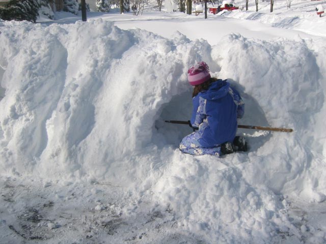 We fed the girls a low-calorie breakfast of bacon, eggs, 3 kinds of pancakes, and real maple syrup, and we were once again content to live on their scraps. Then the girls went out to play. Of course, when I say "play", I mean "create more work for Ben". They turned the driveway into a little city by carving out little "houses" in the snow walls. Now, where do you think all the snow that they dug out went? That's right. So I got out the shovel and cleaned up all the construction rubble, because God forbid I should rest after having moved 73 tons of snow the previous day.