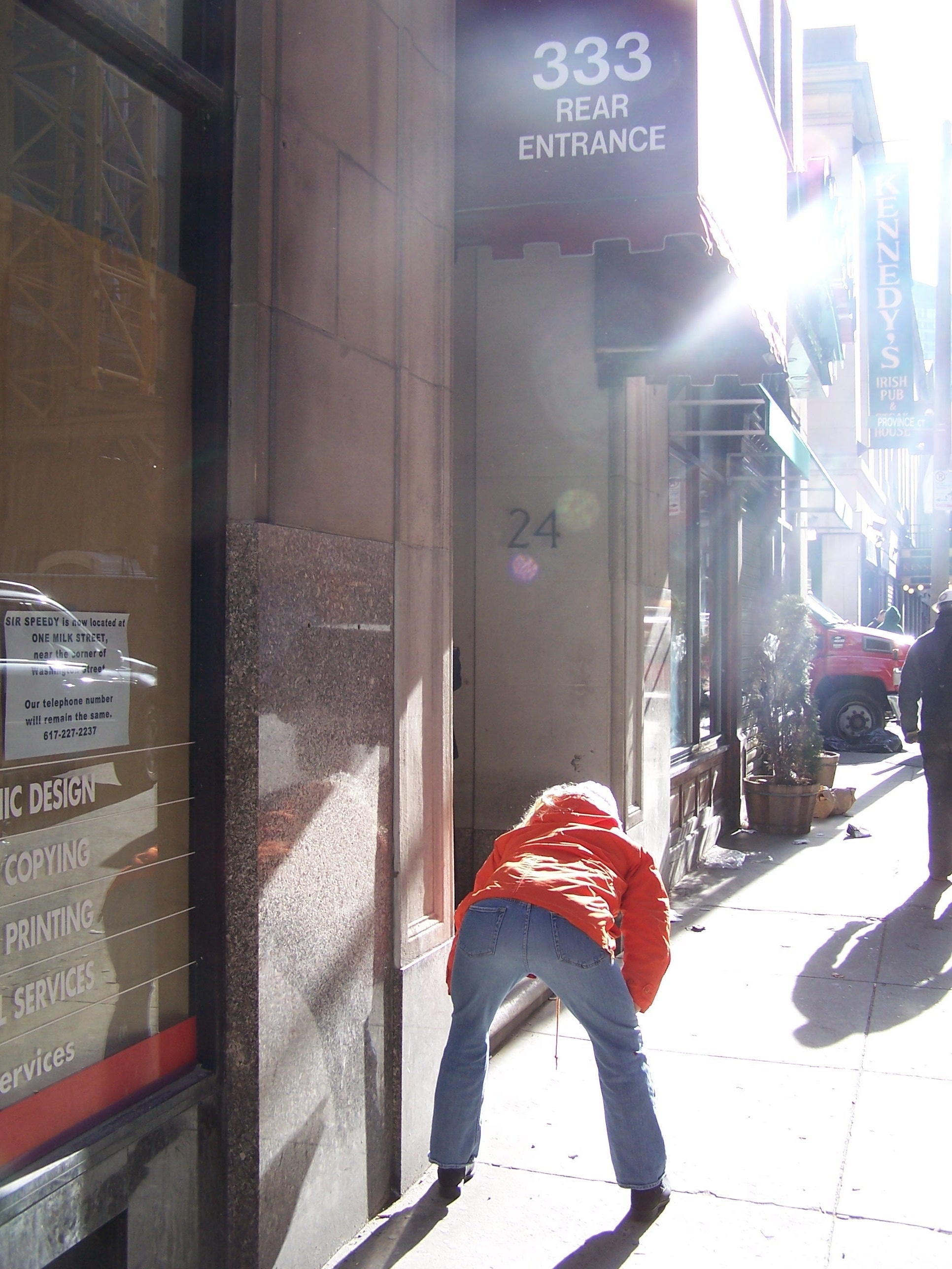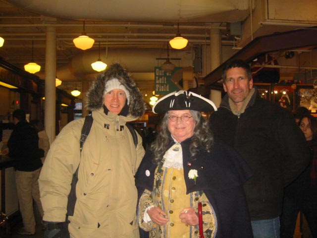 Saturday brought typical February Boston weather: sunny, dry, and chillier than Hillary's love hole. We took the T to Boston Common and walked the first half of the Freedom Trail. We stopped at Finagle a Bagel, which has a neat contraption where a conveyor belt brings a whole bagel to a circular blade that cuts it in half and whips it down the line. Click here for a video. We had a bite at the Hub Pub, where our bartender had one of the thickest Boston accents we heard all weekend. Next to the pub there was an awning that said "Rear Entrance", so of course Trixie had to bend over in front of it while Marty snapped her picture, causing a construction worker to shake his head and say, "Now I've seen everything."