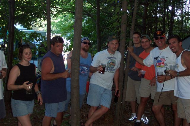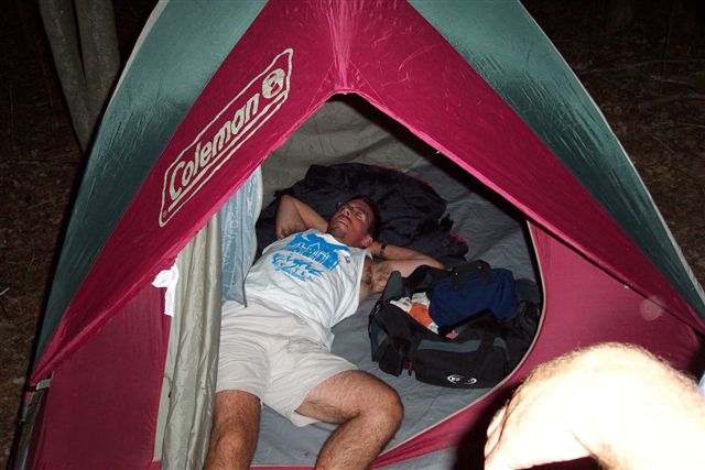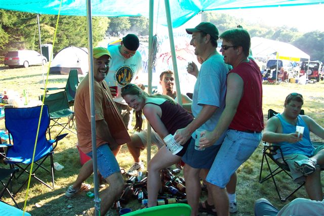 Later that night we revisited Keg Row, listened to musicians jam around the campfire, and hung out at Camp CRABS. At one point someone announced that James had fallen asleep with his ass sticking out of his tent, and Jim, being the compassionate, sensitive person that he is, exclaimed, "Let's fuck with him!" Then he and a few others headed off to James's tent humming the theme music from "Deliverance".