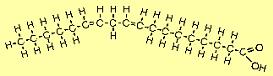 | The molecule to the right is linoleic acid (C18H32O2). FAs such as this with two or more double bonds are called polyunsaturated fatty acids (PUFAs). Since the first double bond occurs at the 6th carbon from the omega end, it is sometimes referred to as an omega-6 FA. | ![]() |