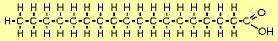 | The molecule to the right is stearic acid (C18H36O2). The O and OH on the right form what's called the carboxyl end, and the other end is called the omega end. FAs such as this where all the carbons (except the rightmost) are "saturated" with hydrogens are called saturated fatty acids (SFAs). SFAs are solid at room temperature because their straight configuration allows them to pack tightly. | ![]() |