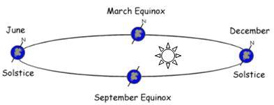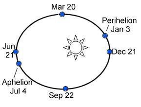Earth’s orbit is elliptical, with the Sun off-center. The point where Earth is closest to the Sun is called the perihelion, and the point where it’s farthest from the Sun is called the aphelion. This might seem puzzling at first, when we see from the figure below that we are closest to the Sun in winter and farthest away in summer. Shouldn’t it be the other way around? No, because seasonal change has little to do with how far Earth is from the Sun. If solar proximity caused the change in seasons, then the northern and southern hemispheres would have similar temperatures all the time. The two hemispheres’ seasons actually run opposite each other: when one is in winter, the other is in summer.